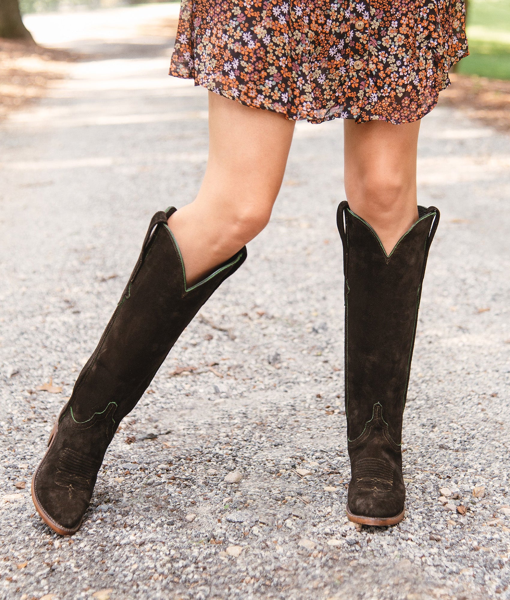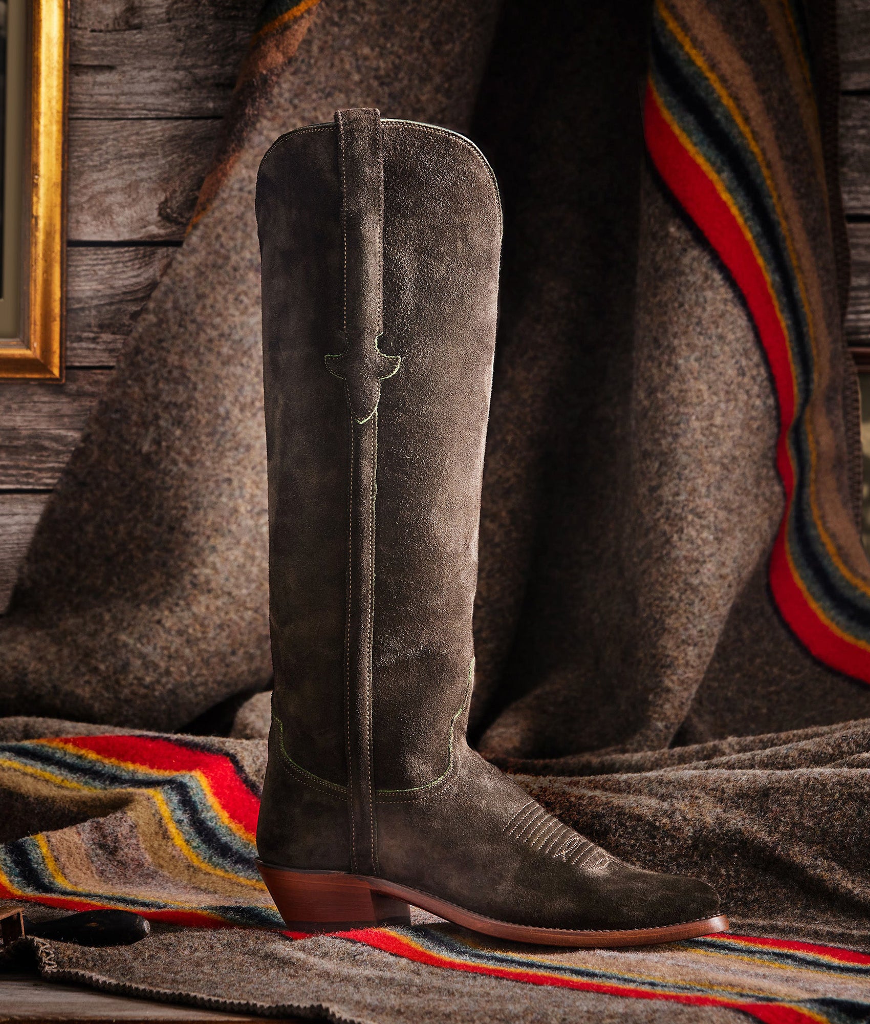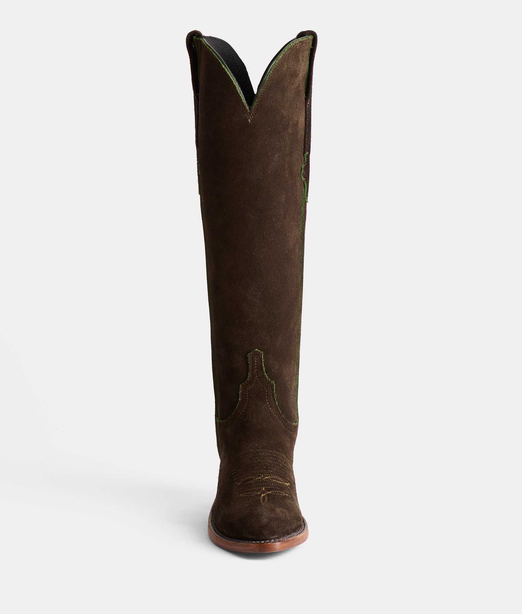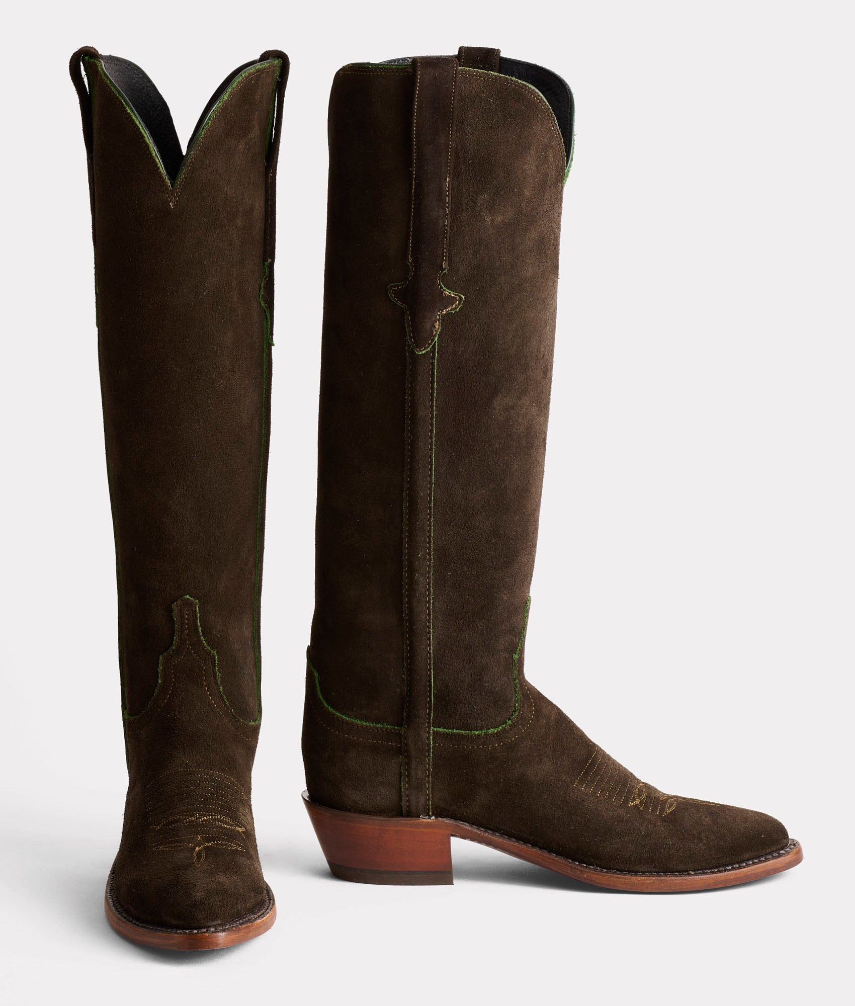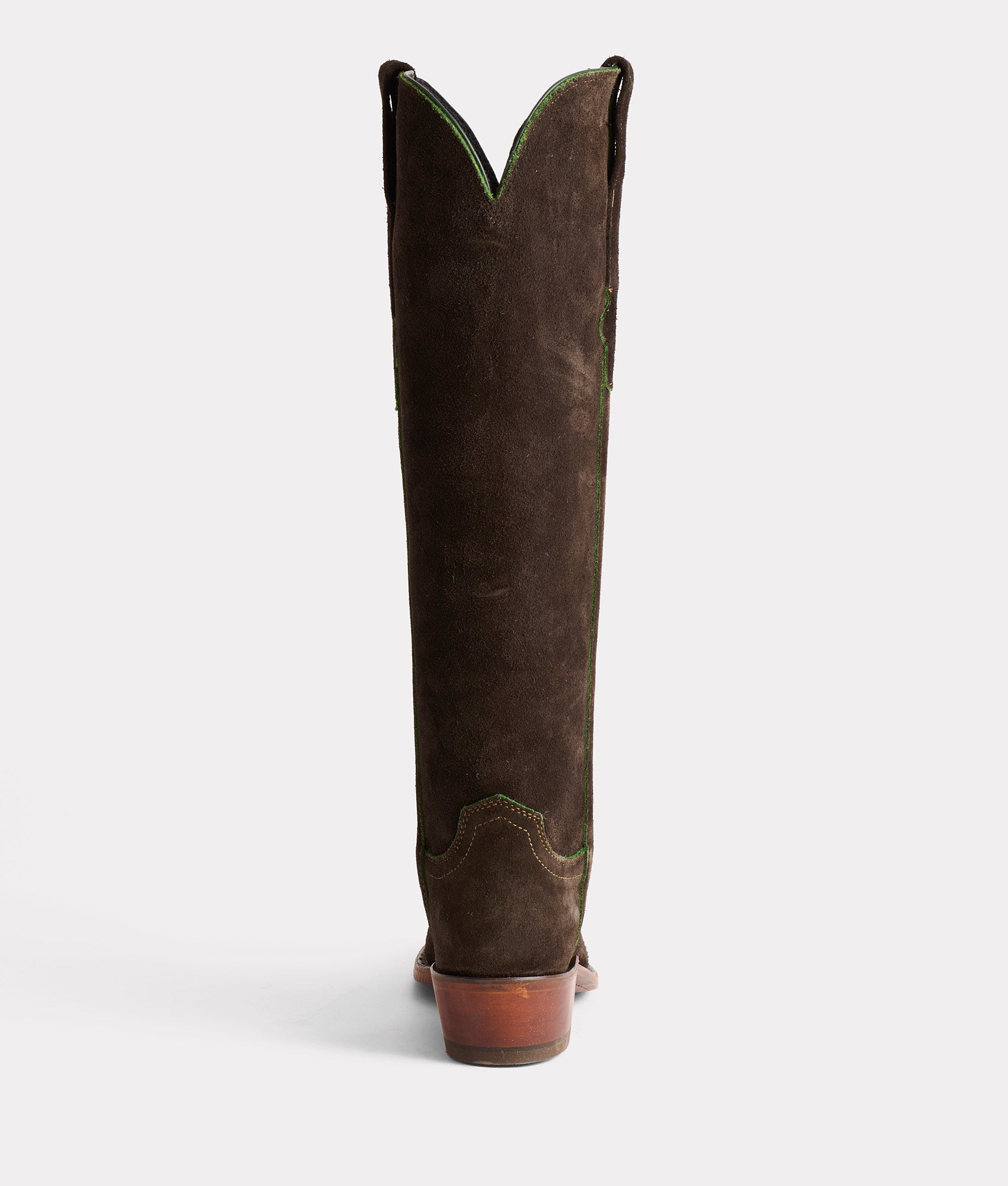 Crafted from silky scuff-off sandwich suede. Edie is a 17-inch-tall stunner. The military precision in style and in craft creates an elegance in nature and yet commands attention. With Western styling. an exterior Torero side seam and Kennedy pull straps. Edie makes a sophisticated cowgirl statement. Handmade in Texas.