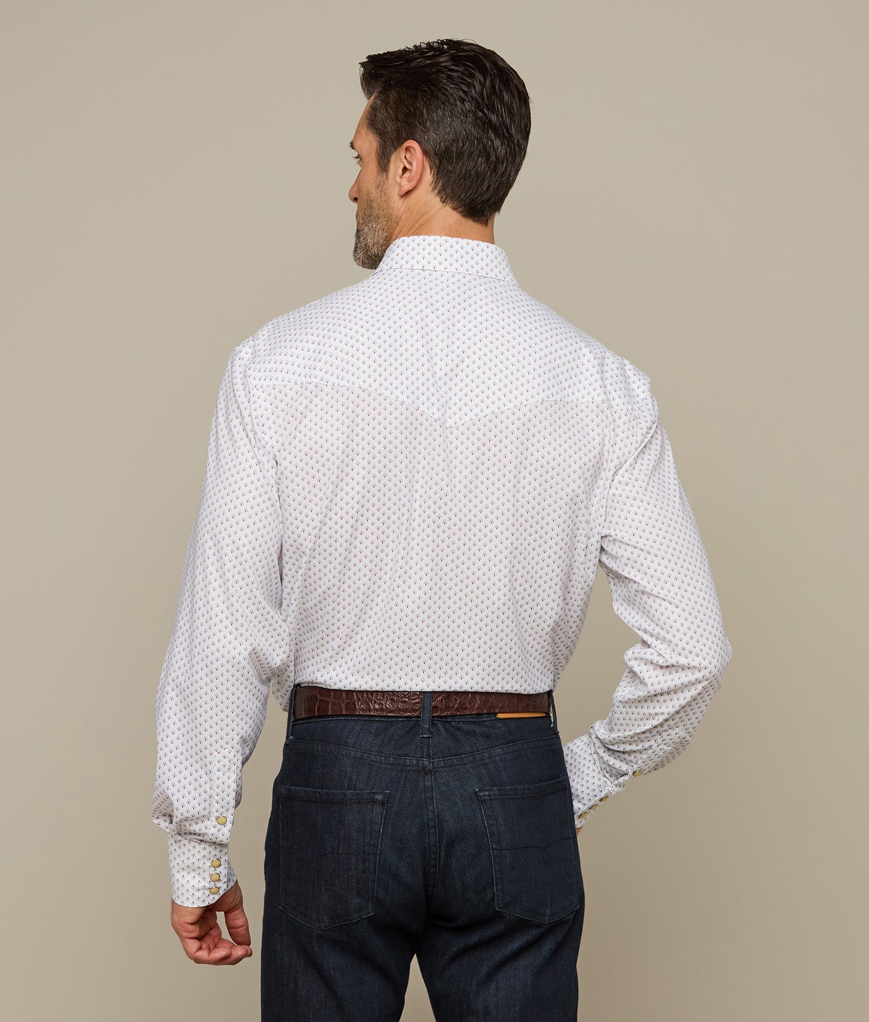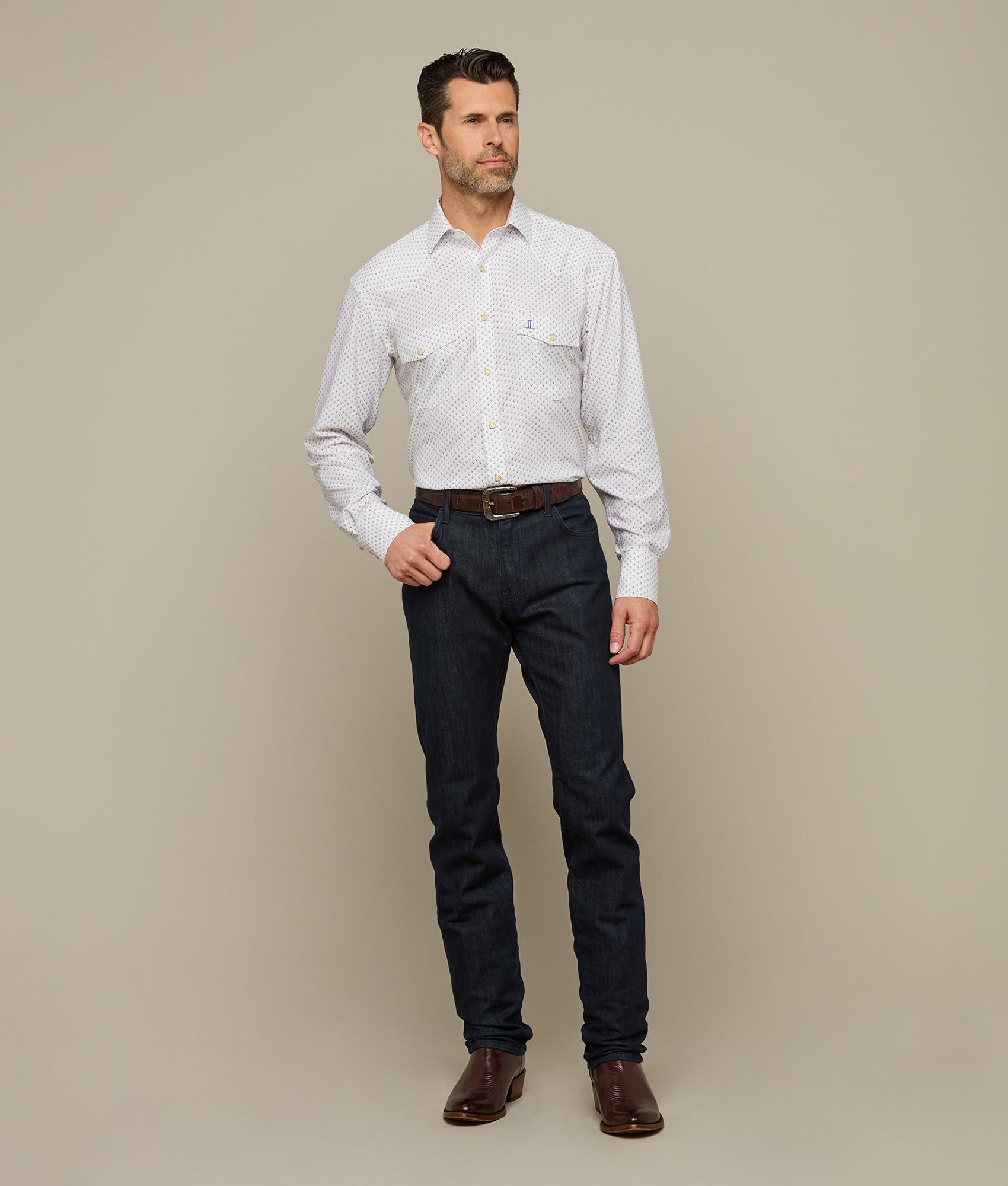 Named for the Texas city where Lucchese’s renowned bootmaking factory resides. the El Paso blends Western utility with refined design. Defined by its snap-front closure. dual chest pockets. and barrel cuffs. it embodies the character of its namesake. The cowboy fit is designed for a traditional Western build. It features a roomy chest. broad shoulders. and a longer torso for confident tucking. Extended sleeve length and a fuller bicep cut allow for ease of motion.