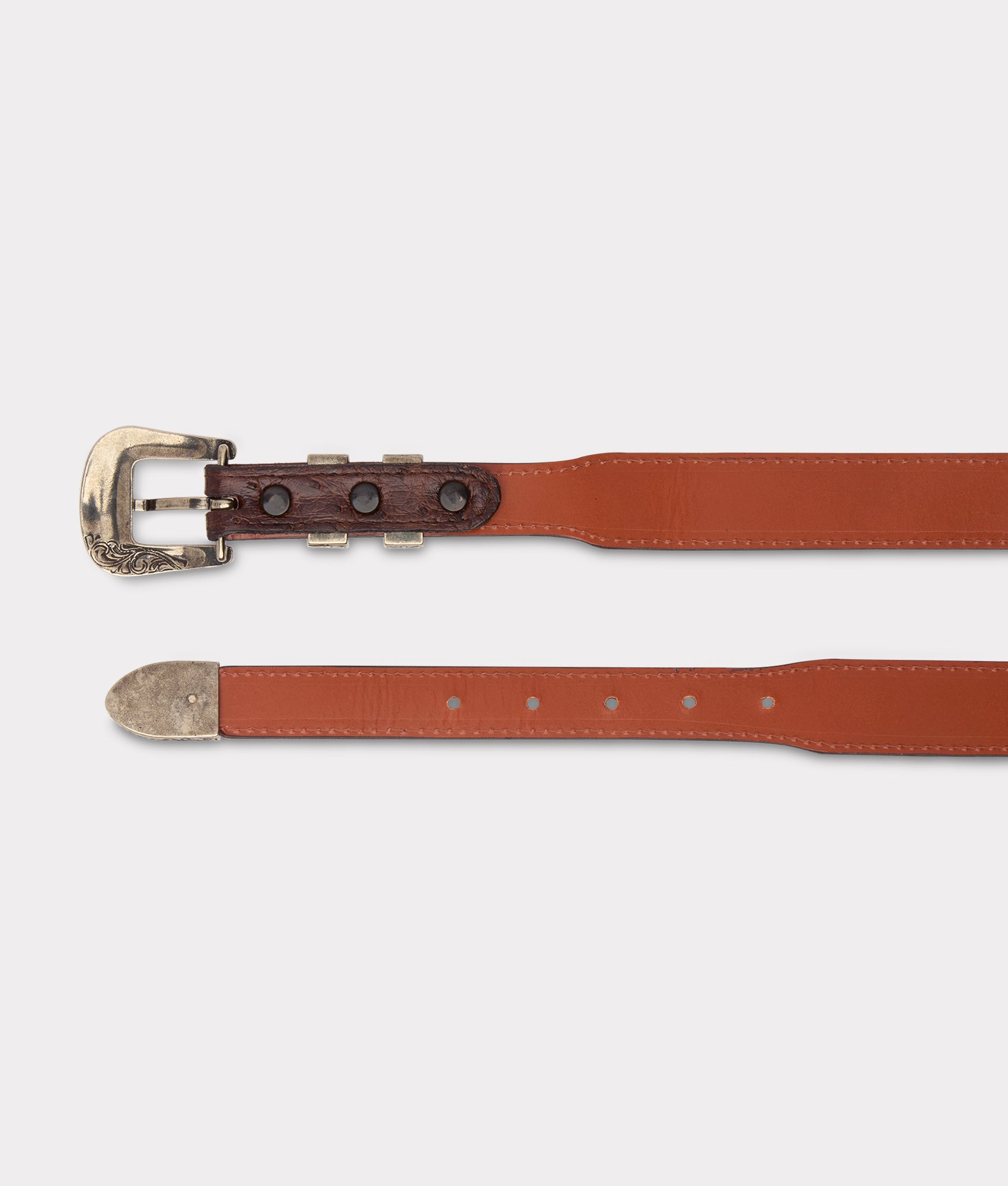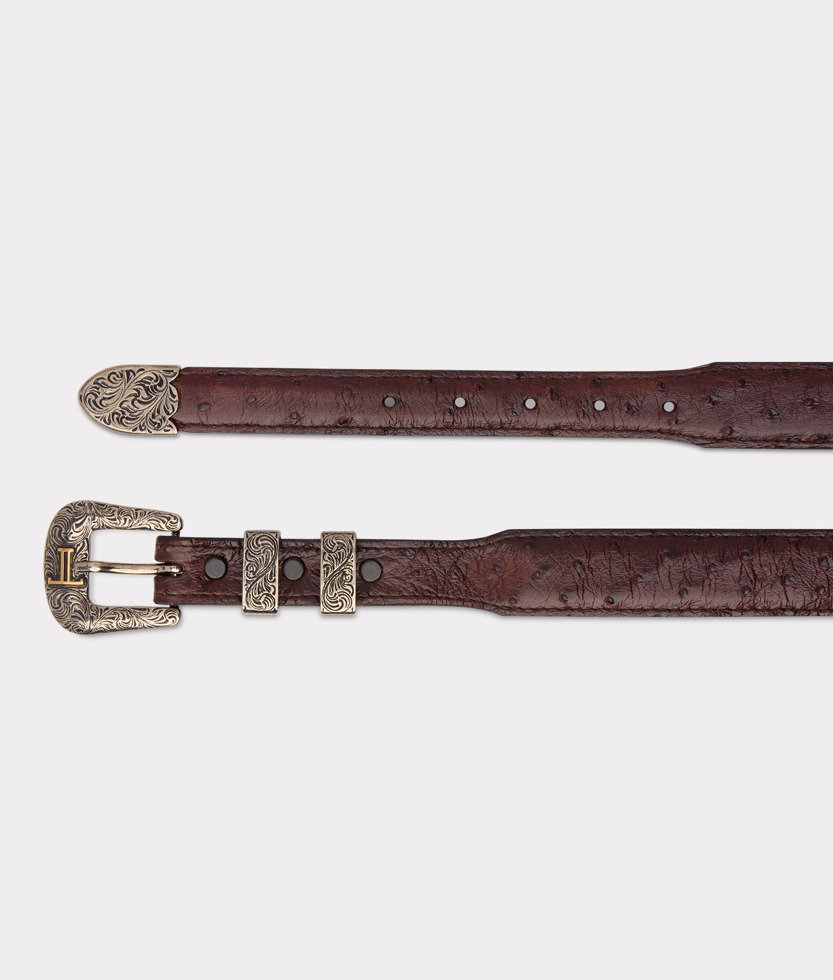 Lucchese’s exotic belt made with full quill ostrich leather. The belt’s full quill ostrich leather is complemented by an ornate silver plated buckle giving it the ultimate Western touch. making it versatile. handsome. and stylish. This belt was designed to be worn with matching full quill ostrich boots. but can also be paired with jeans or a suit. Handmade in Texas. 1.25 tapered down to 1 Silver plated tip Removable buckle
