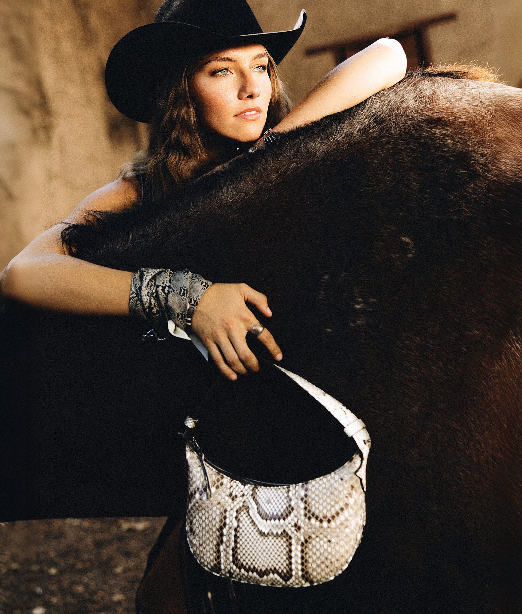 The Mini Heidi Hobo in Python is a study in refined texture and modern elegance. Each scale creates a natural mosaic. rendered with the precision and artistry of Lucchese craftsmanship. Polished nickel hardware accentuates the exotic leather. while the compact silhouette balances everyday practicality with high-style appeal. Designed to move effortlessly from day to night. this hobo embodies sophistication in every detail.