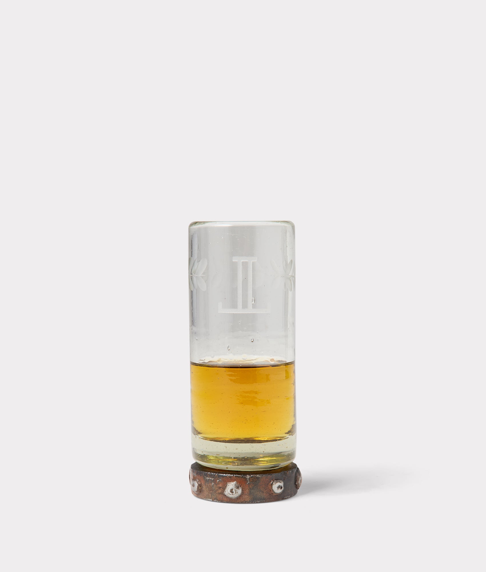 Each piece is individually cast or wrought. and may be hand-worked. hammered. sanded. and hand-finished. Each piece can differ slightly from the other which adds to the uniqueness. The Mirrored L Triple Zackshot Glass features a sophisticated design with mouth-blown glass that showcases exquisite craftsmanship. The beaded iron base provides both stability and a striking contrast to the smoke grey glass. making this piece a unique and stylish addition to any barware collection.
