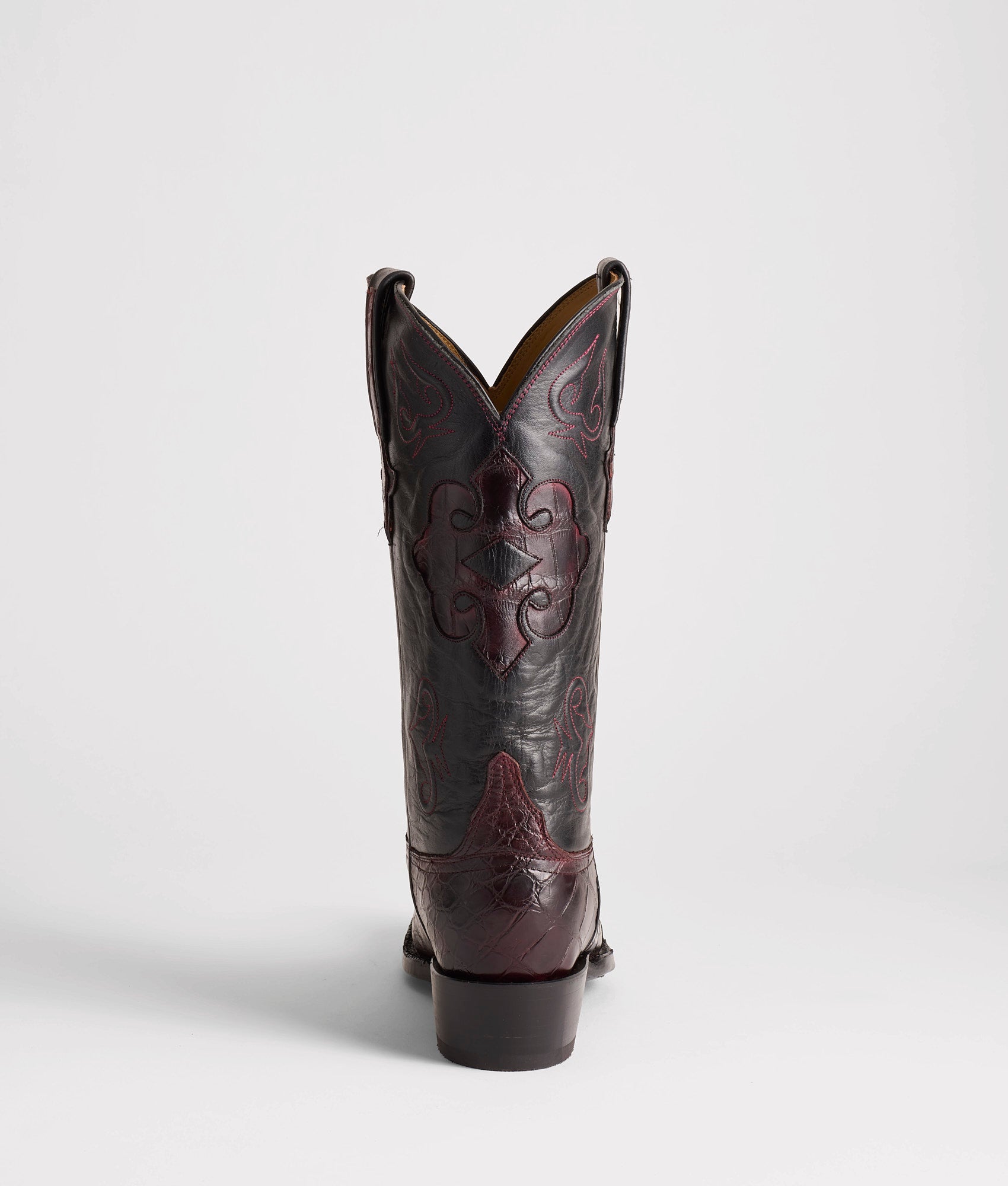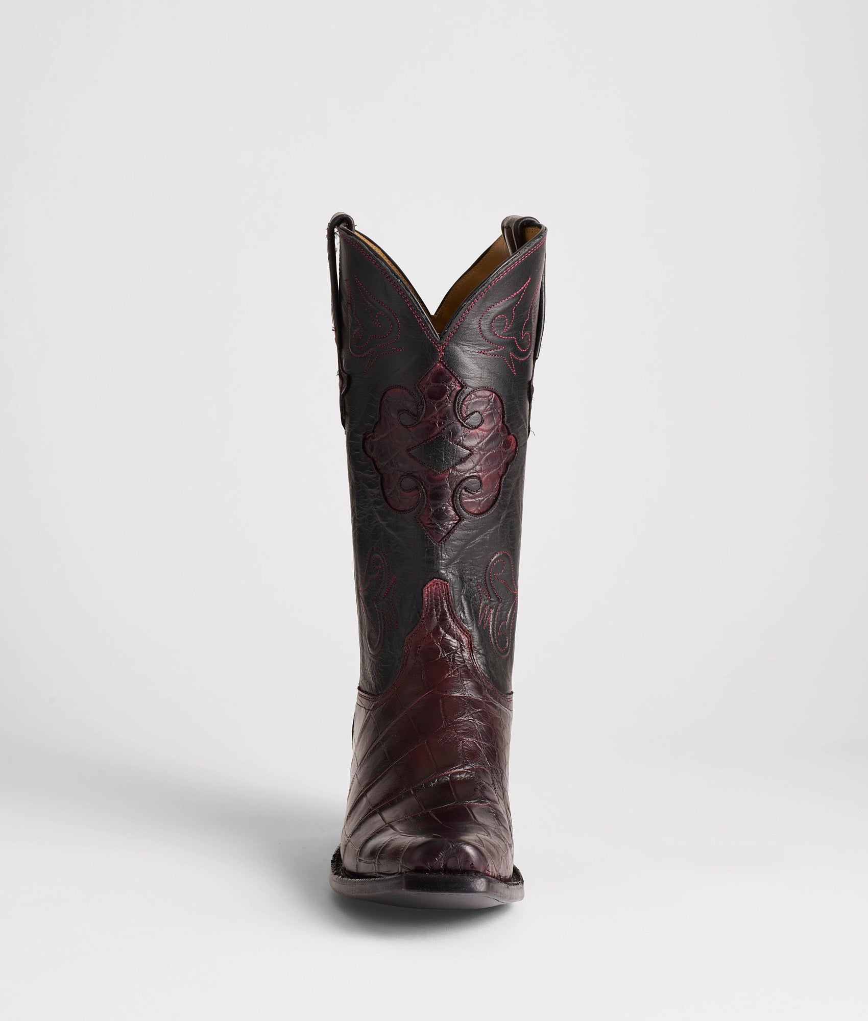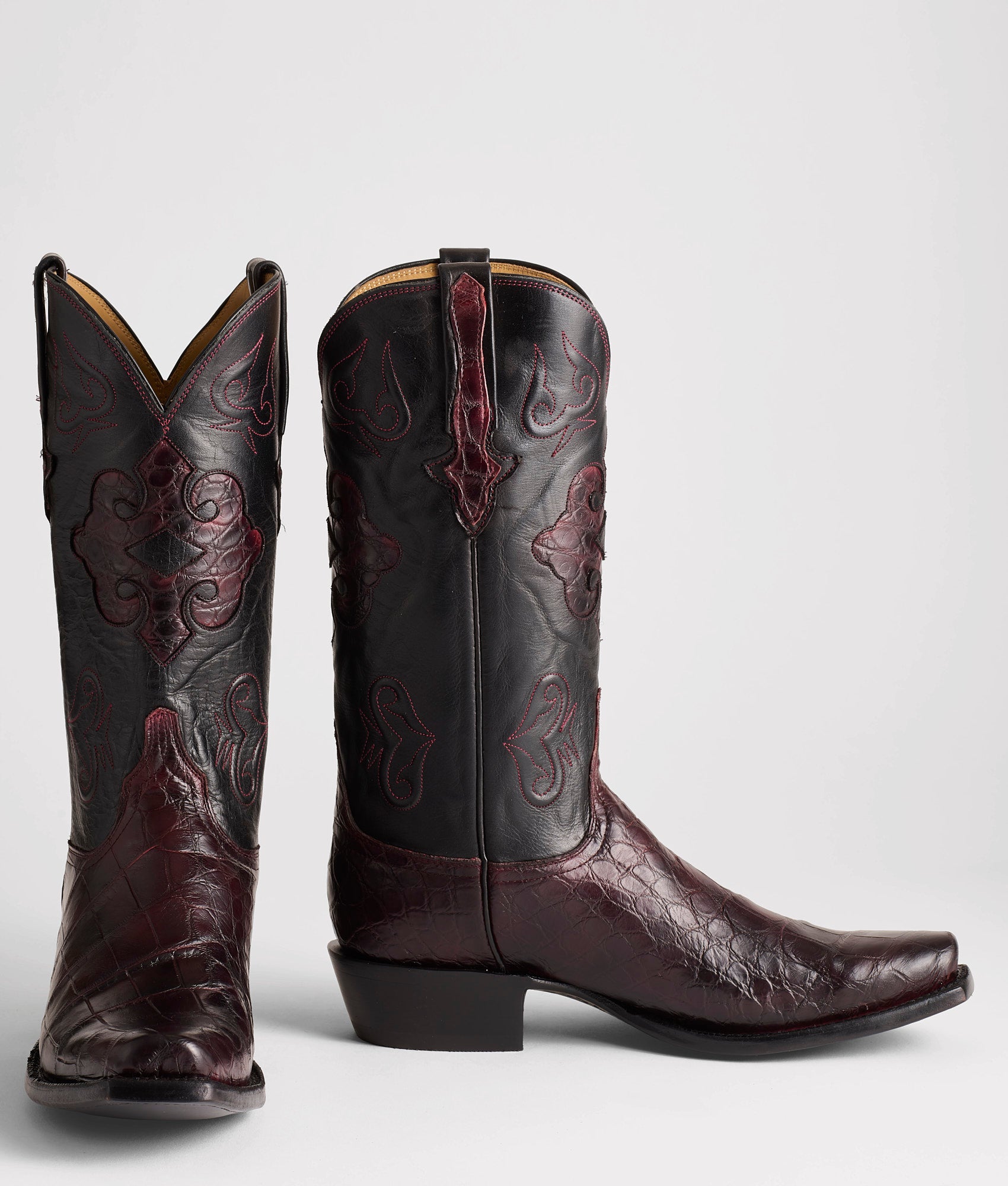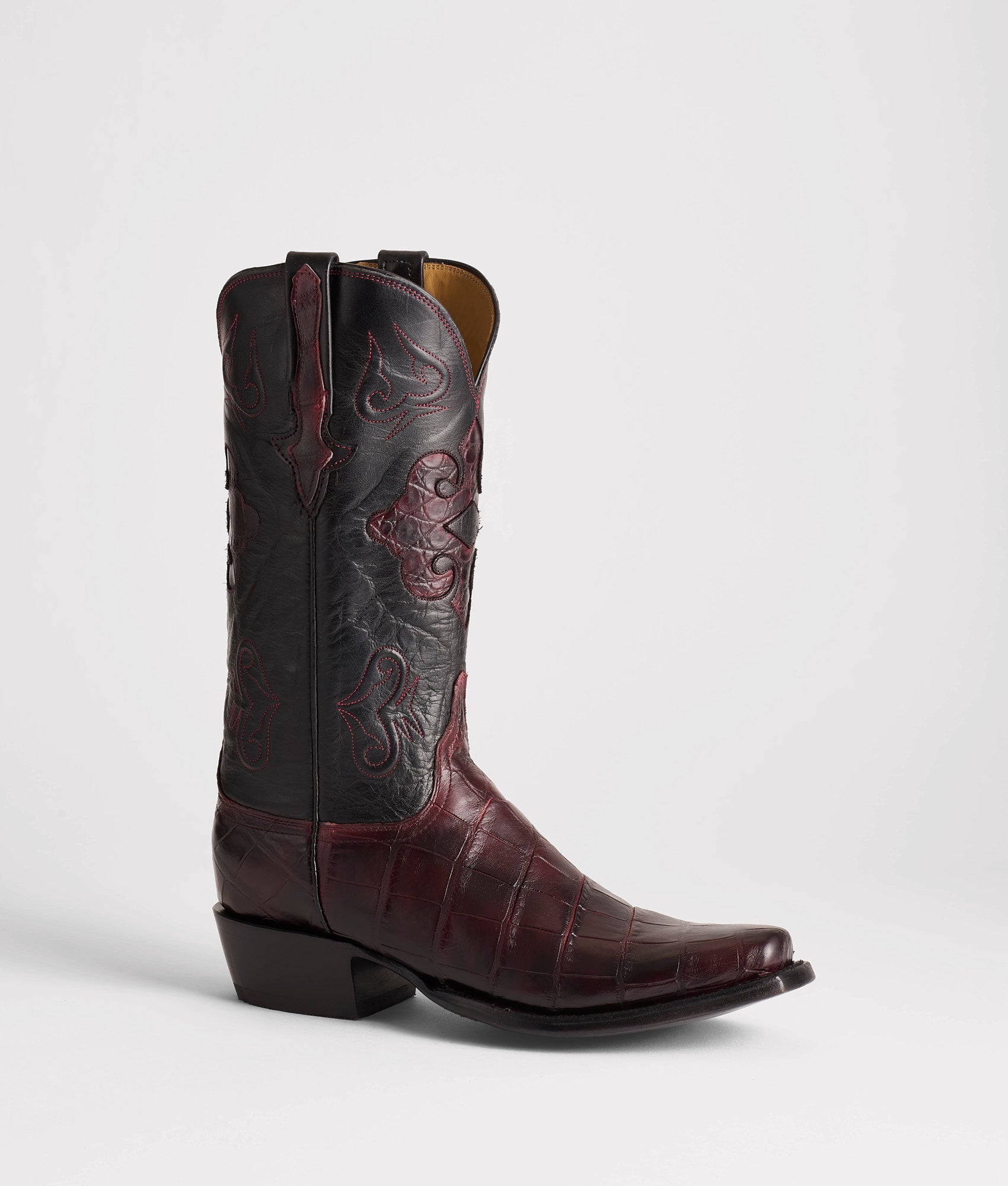 The Mission is a Texas cowboy boot shaped by Spanish influence that stretches back to the 1600s.?Crafted in brand-new. hand-stained Wild-Caught American Alligator. it carries the soft. even grain of American Alligator. enriched by the subtle scars and gnarly character of its Wild-Caught Giant Gator counterpart. Paired with Bovine quarters. it perfectly balances softness and durability. Kennedy pull straps with Alligator overlays and cording adornments accentuate the intricate Mission inlay. Available in a range of colors and toe shapes. there’s a style for every discerning gentleman. Handmade in Texas.