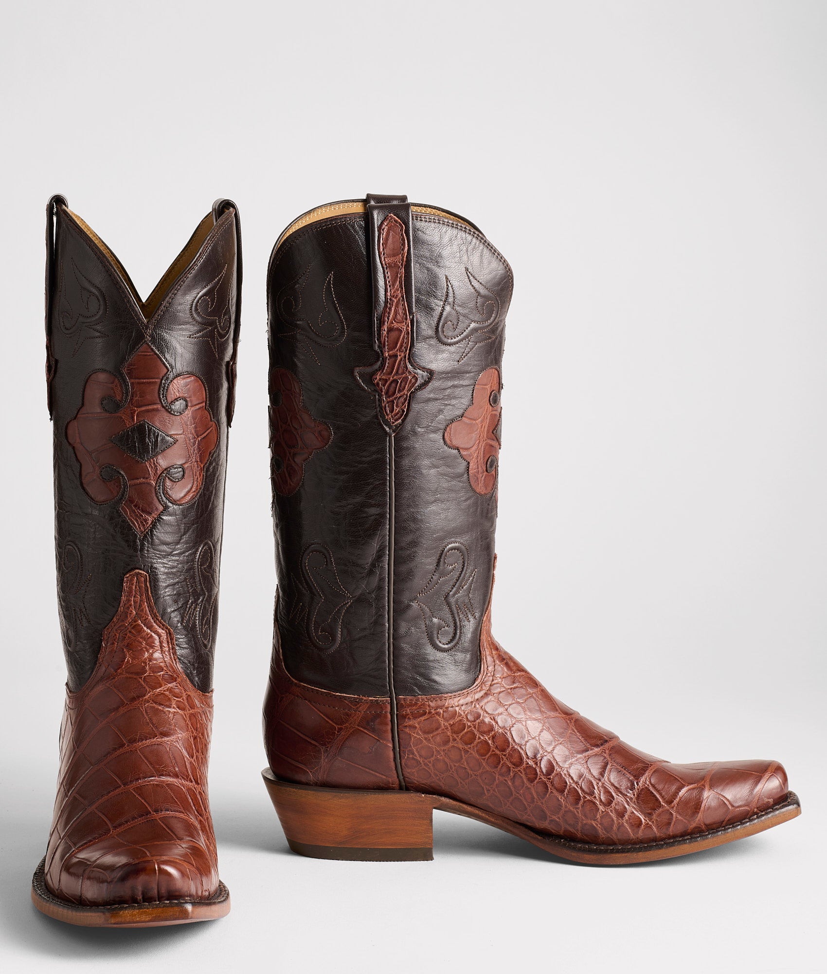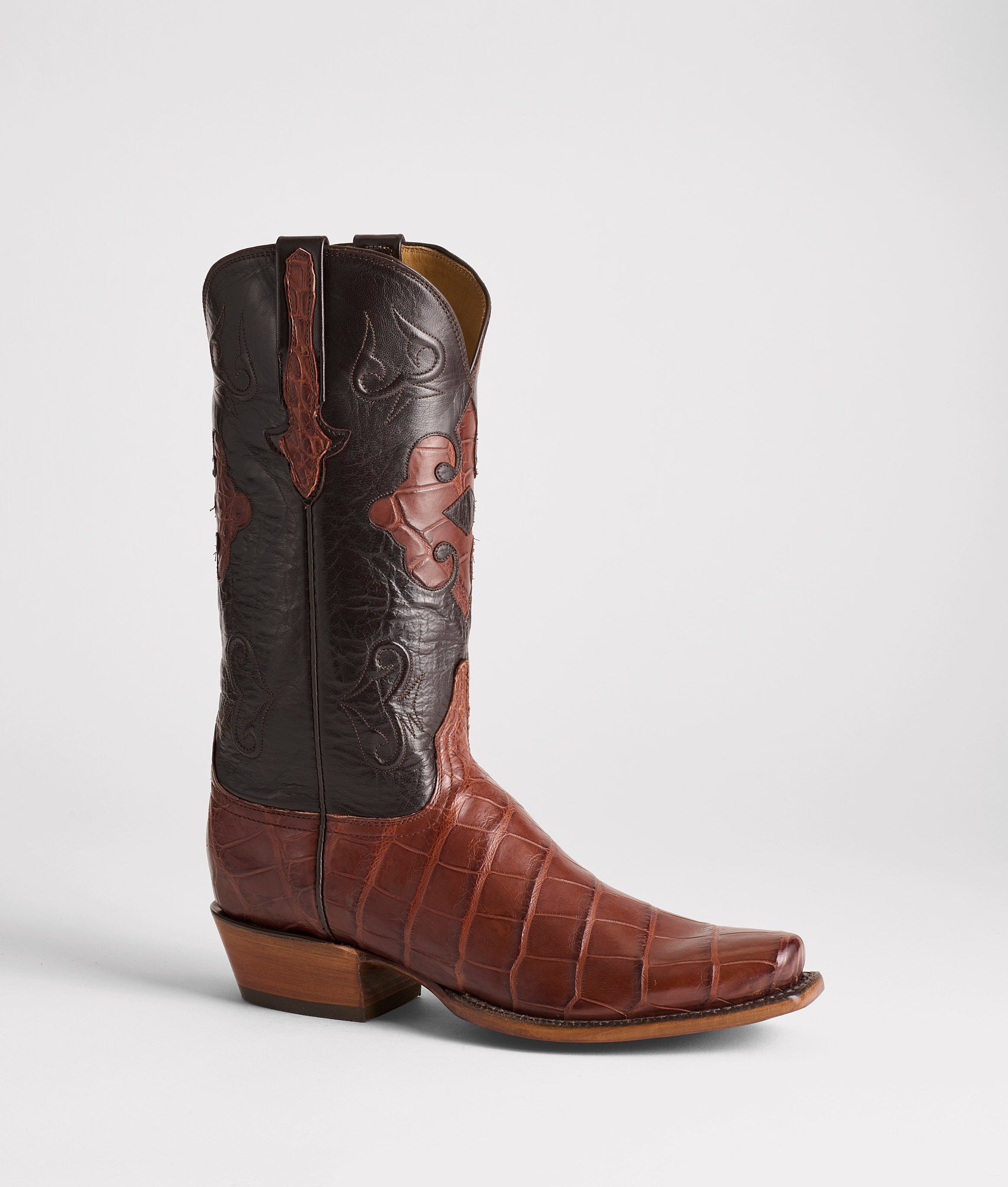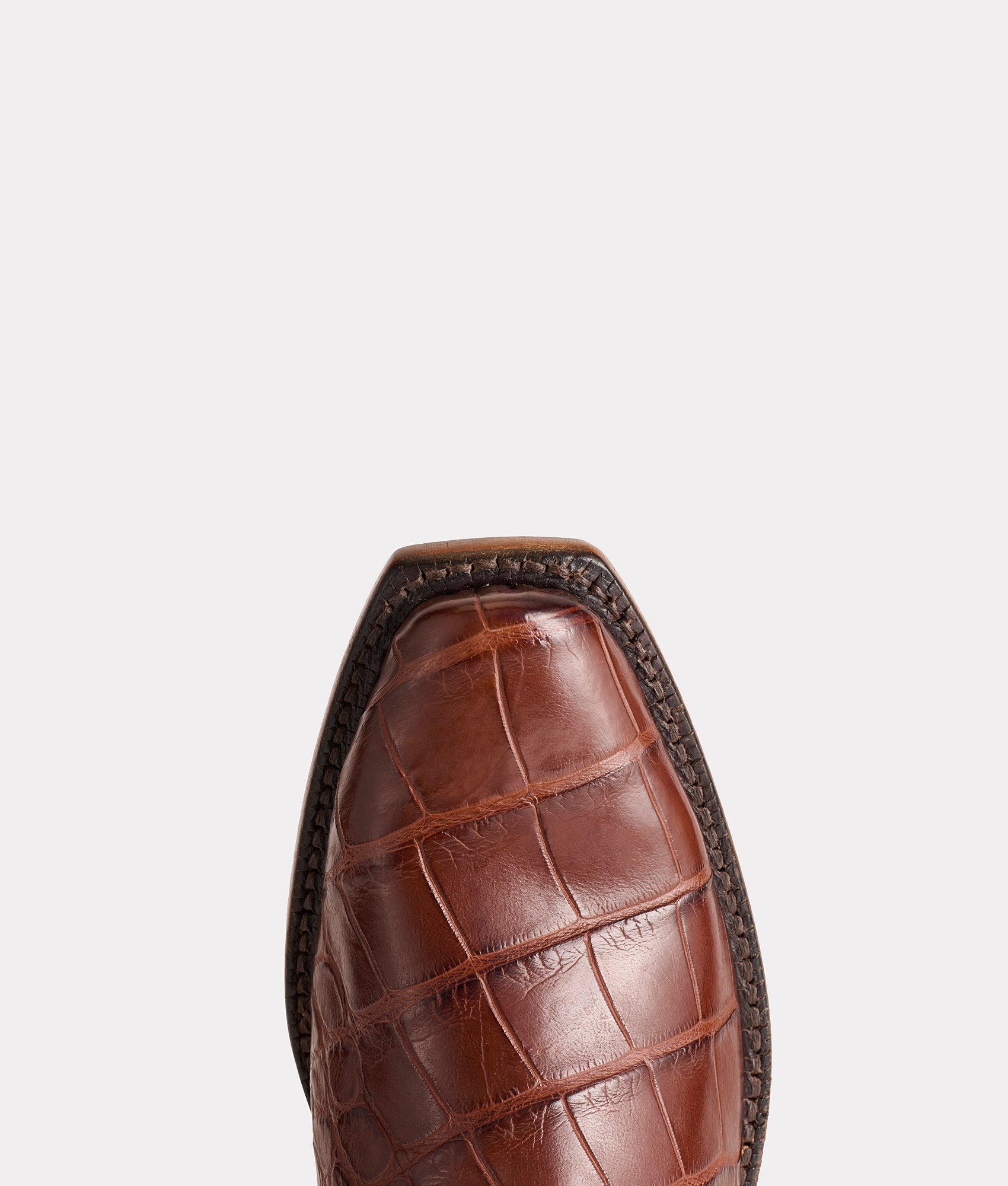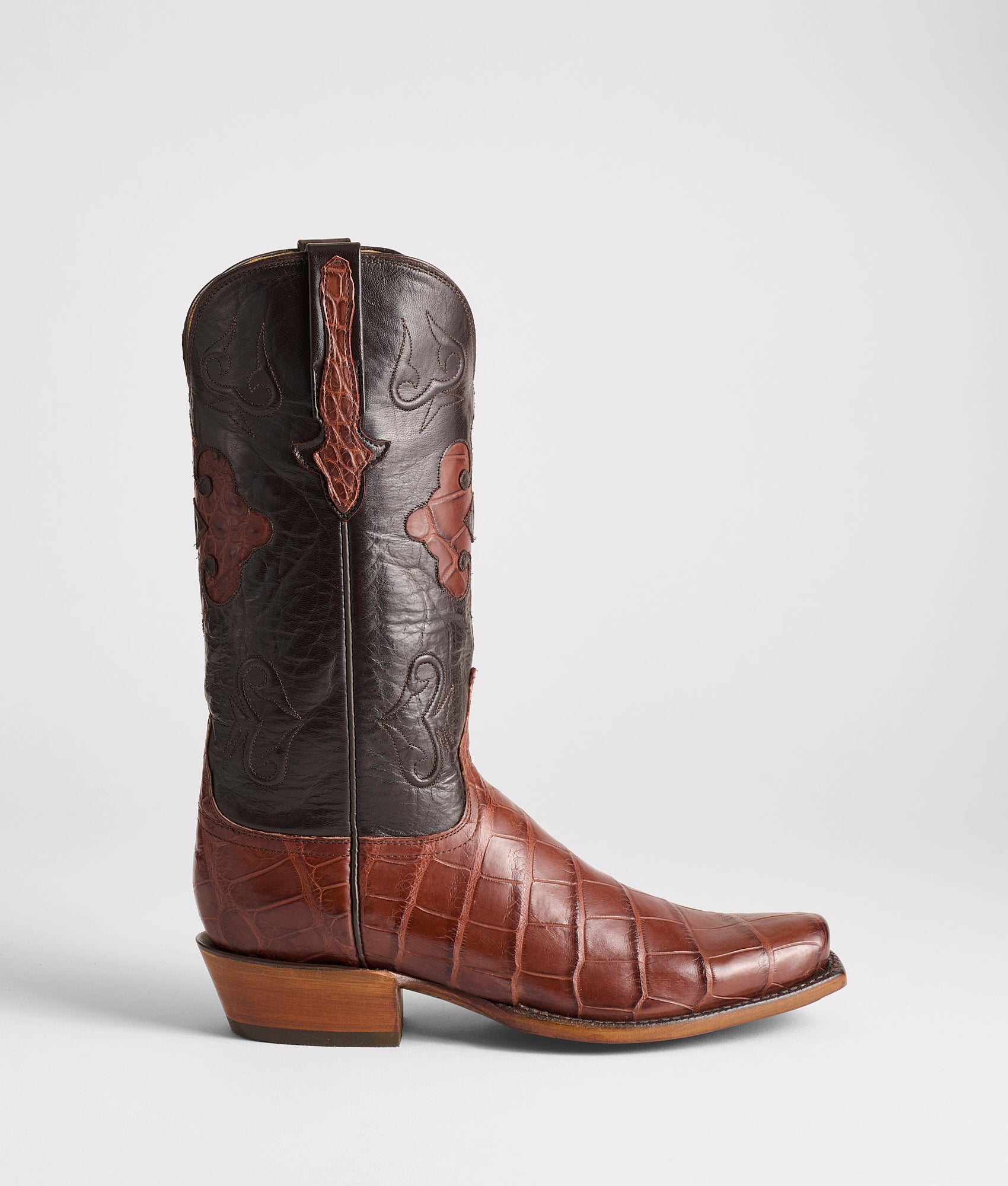 The Mission is a Texas cowboy boot shaped by Spanish influence that stretches back to the 1600s. Crafted in brand-new. hand-stained Wild-Caught American Alligator. it carries the soft. even grain of American Alligator. enriched by the subtle scars and gnarly character of its Wild-Caught Giant Gator counterpart. Paired with Bovine quarters. it perfectly balances softness and durability. Kennedy pull straps with Alligator overlays and cording adornments accentuate the intricate Mission inlay. Available in a range of colors and toe shapes. there’s a style for every discerning gentleman. Handmade in Texas.