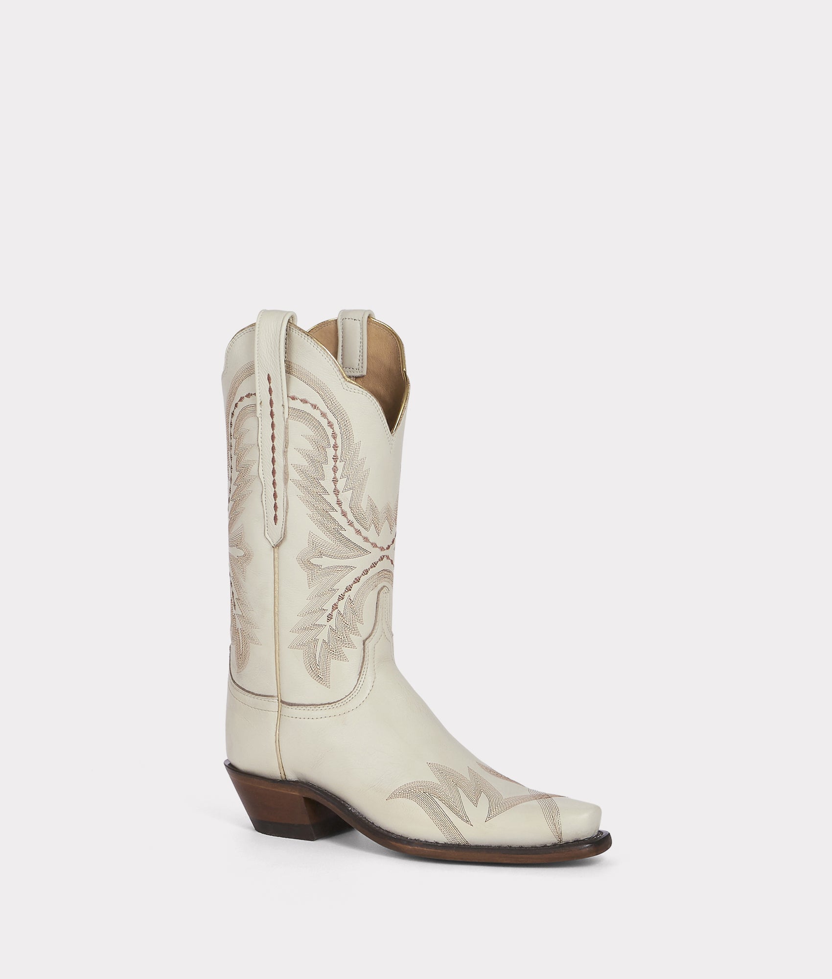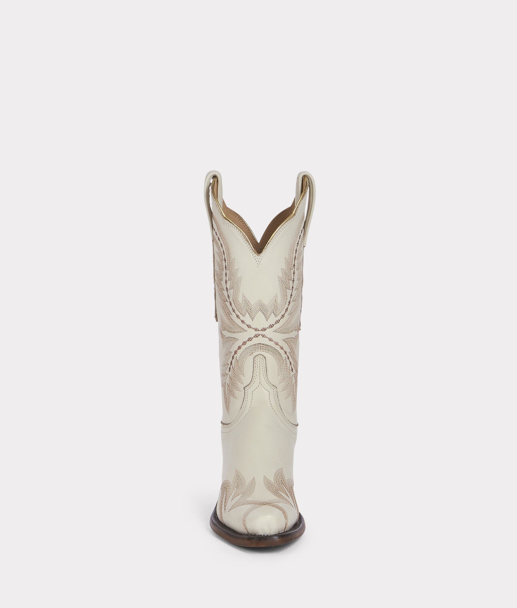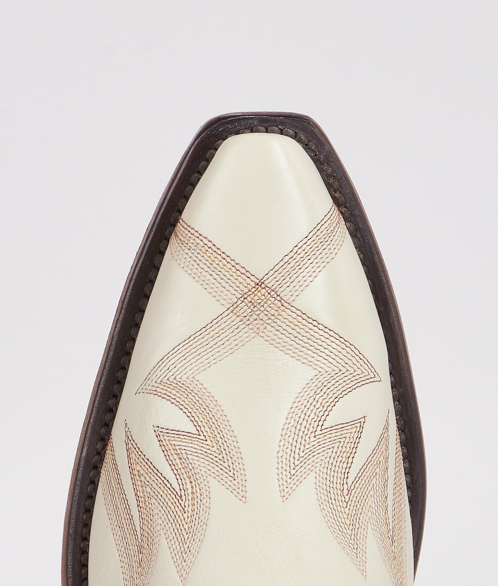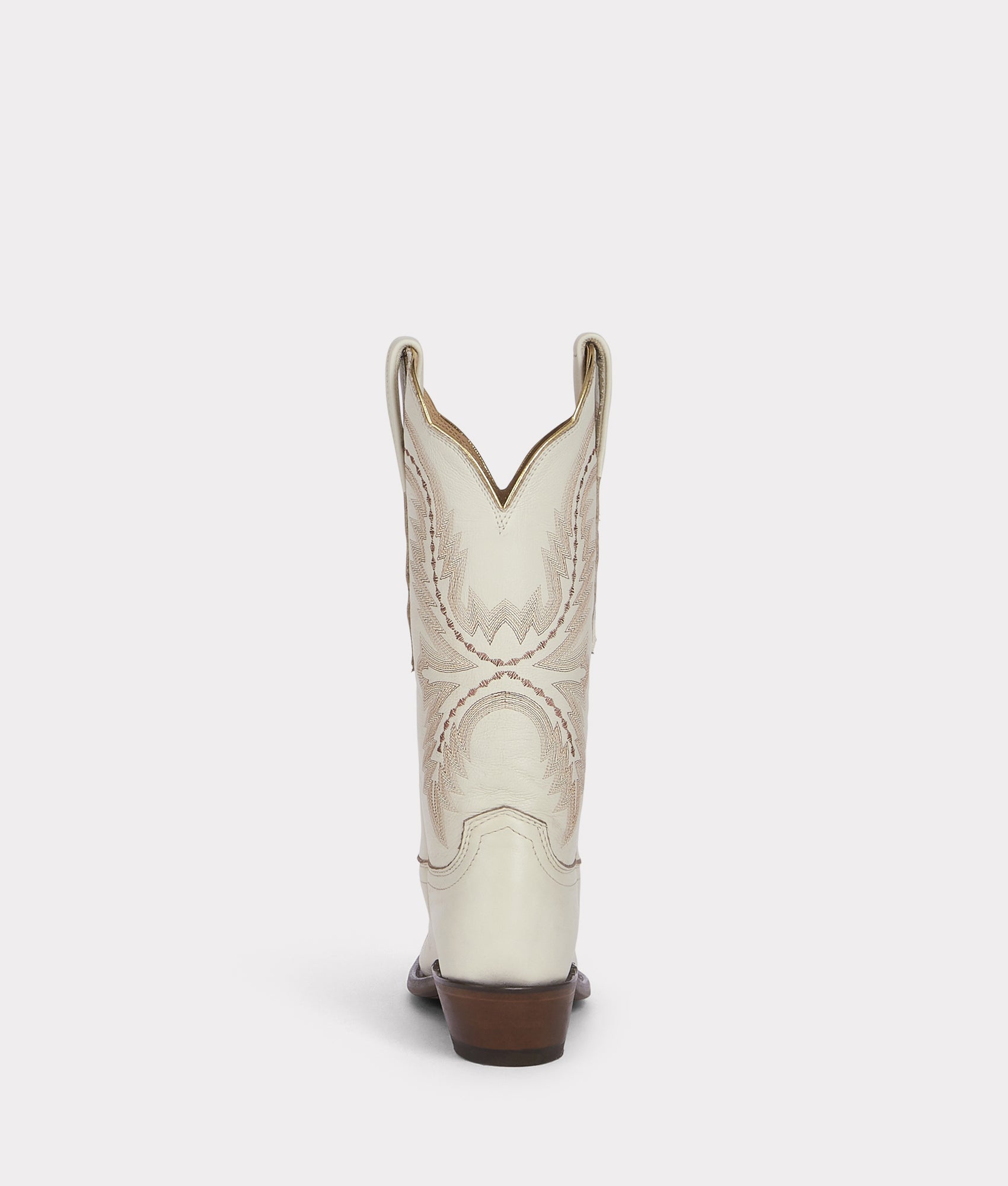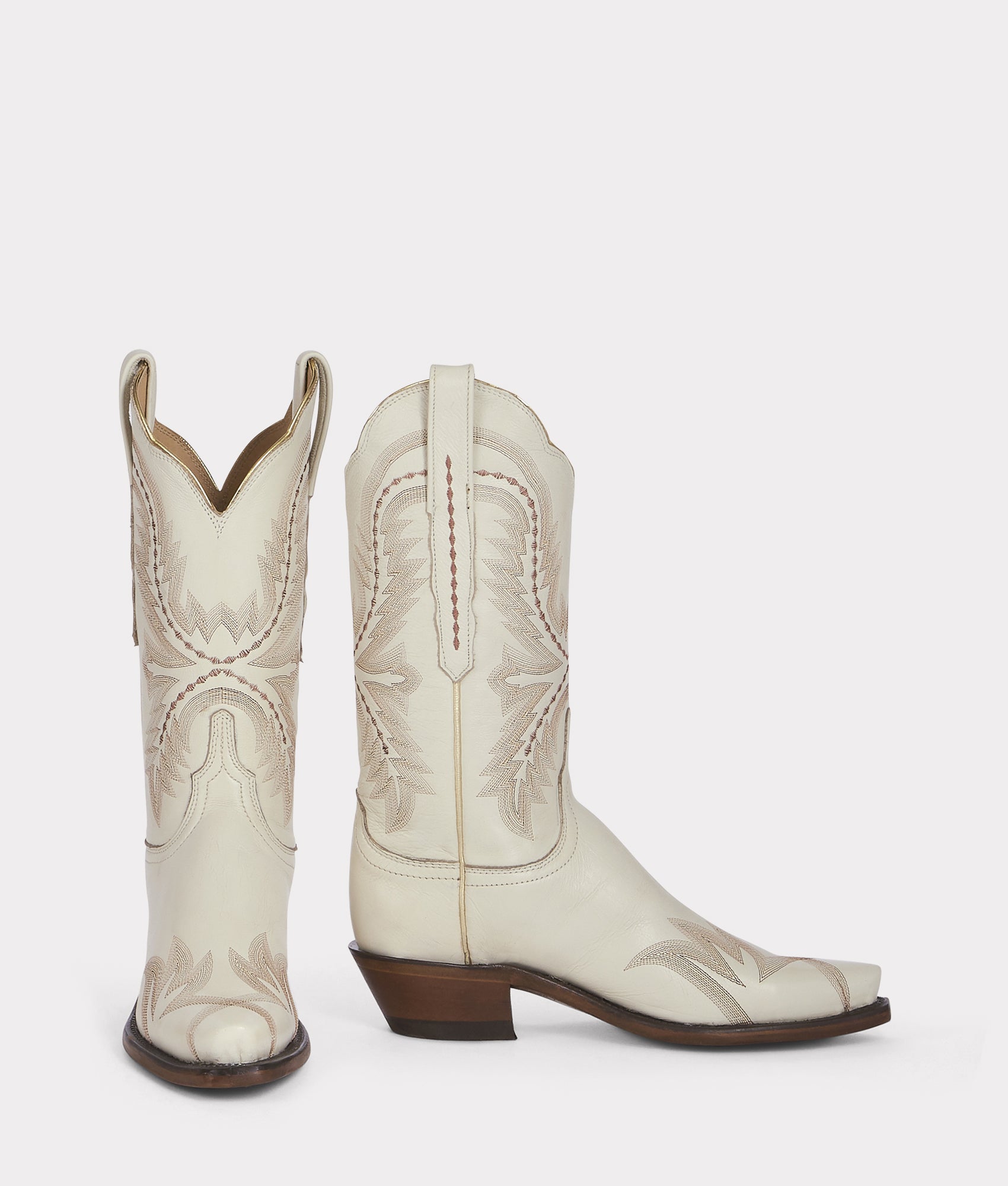 In tonal shades of Mad Dog goat leather. Tilly makes a subtle statement. Detailed stitching on the quarters and vamp is equal parts subdued and striking. Elongated pull straps have a diamond stitch accent. A full welt binds the leather outsole and comfortable insole. Tilly is a little bit sassy and a whole lot of Western chic. Handmade in Texas. Handmade Disclaimer: The product(s) you receive might vary slightly from the product picture due to the nature of your product(s) being 100% handmade to order.